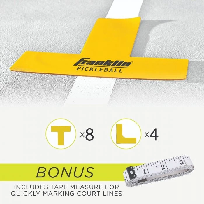 The Franklin Sports Pickleball Court Marker Kit easily transforms any court area into a quick pickleball court. The kit includes (4) L-shaped and (8) T-shaped flexible court markers that can be easily transported with you from court to court. The easy-care material is surface wipeable for easy cleanup and the bright color clearly identifies the court lines.