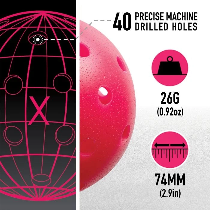 The USAPA approved X-40 Performance Pickleball is a premium quality ball that will play well on any outdoor surface. This ball delivers the best in-game flight out of any ball on the market thanks to our machine drilled holes. The accuracy of the machine drilled holes will assure that each ball will play consistently one after another. The X-40 is the best pickleball on the market, try it for yourself today! USAPA Approved 26 gram weight is perfect for players of all skill levels Official Size, 74mm diameter 40 precisely machine drilled holes create a balanced flight pattern
