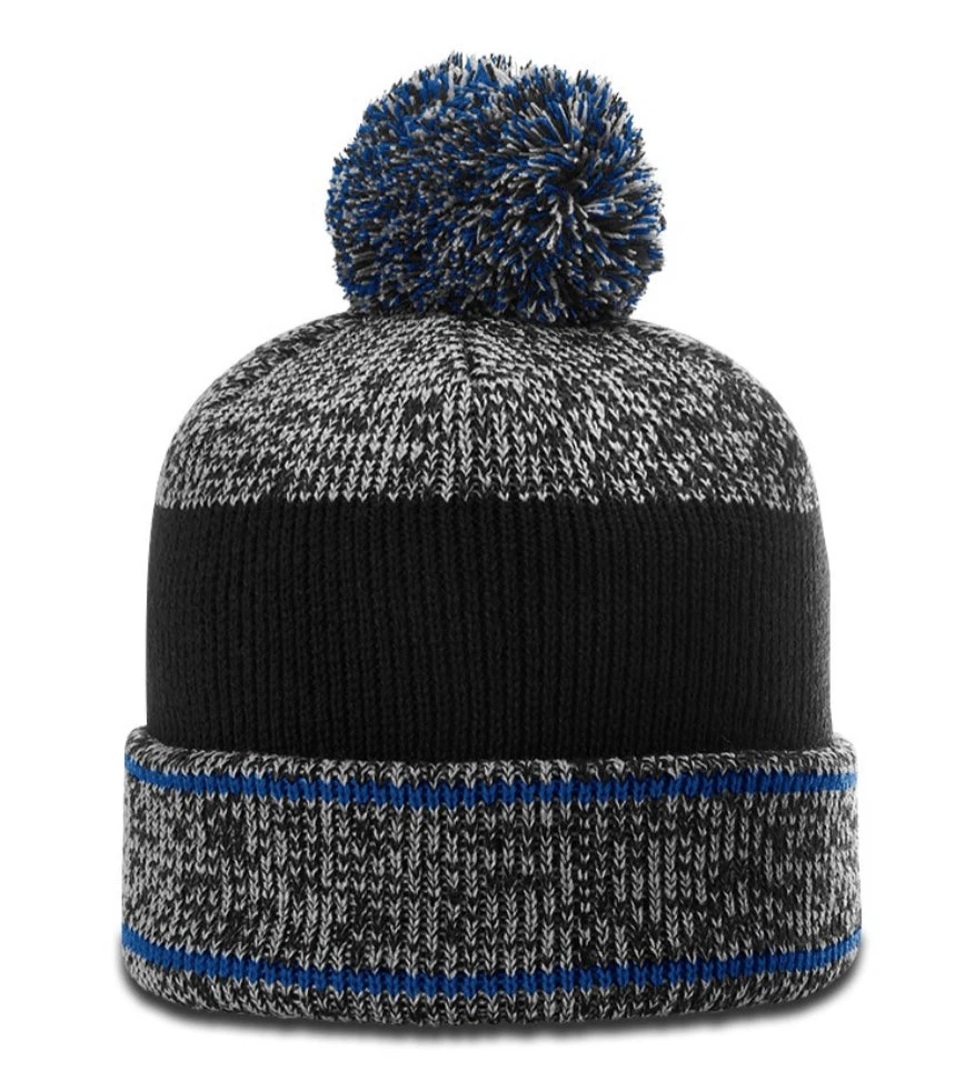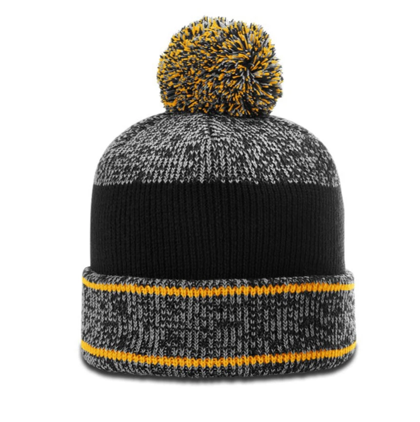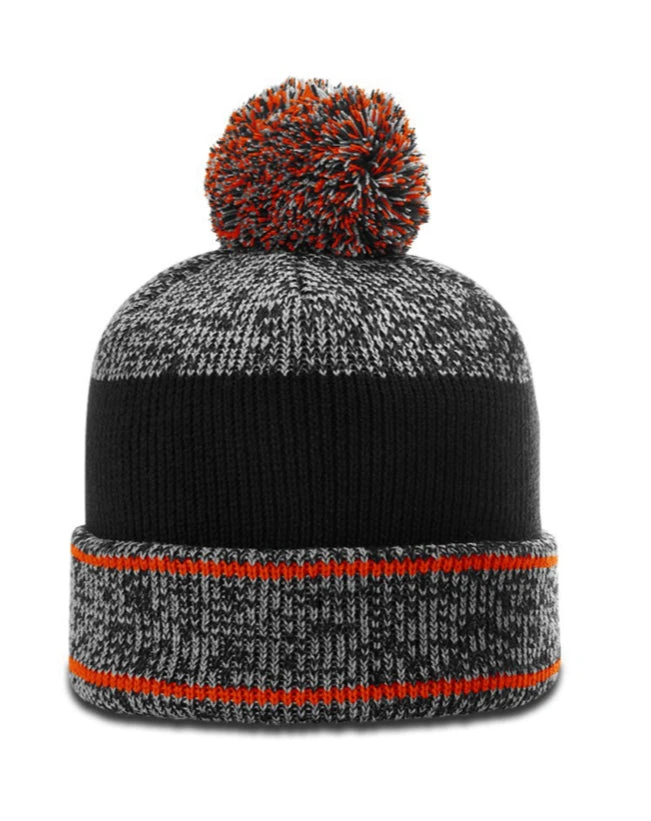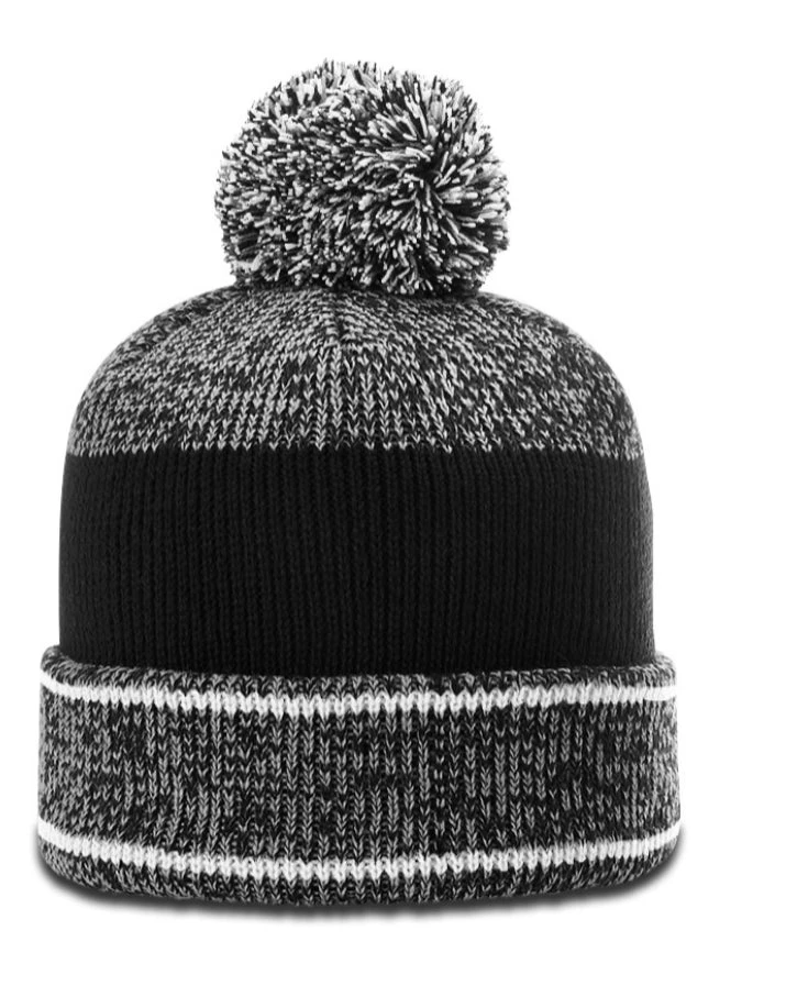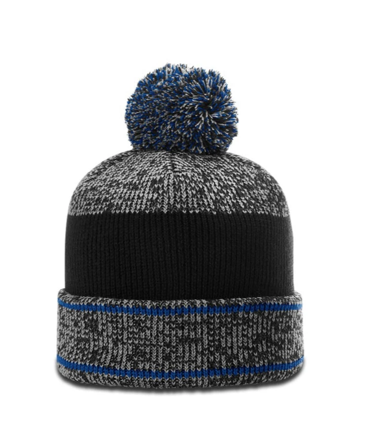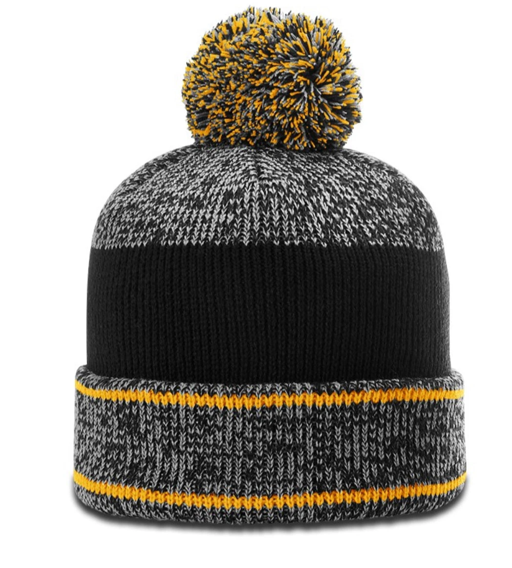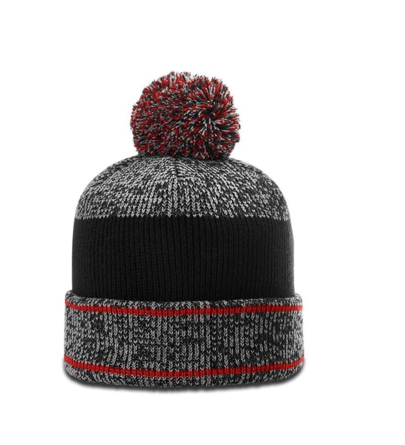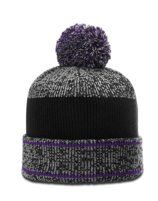 100% acrylic construction is lightweight, soft and warm with a wool-like feel. The cuff provides 360° of space for a custom patch or embroidery, and the three-stripe design and pom add some complementary color to this on-trend style.
