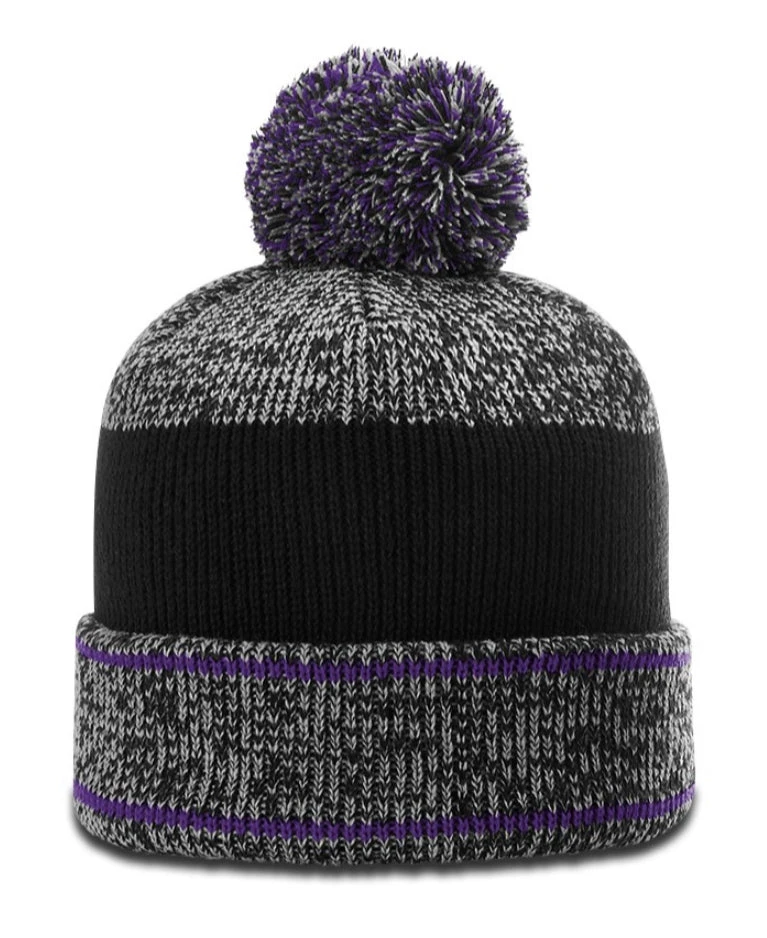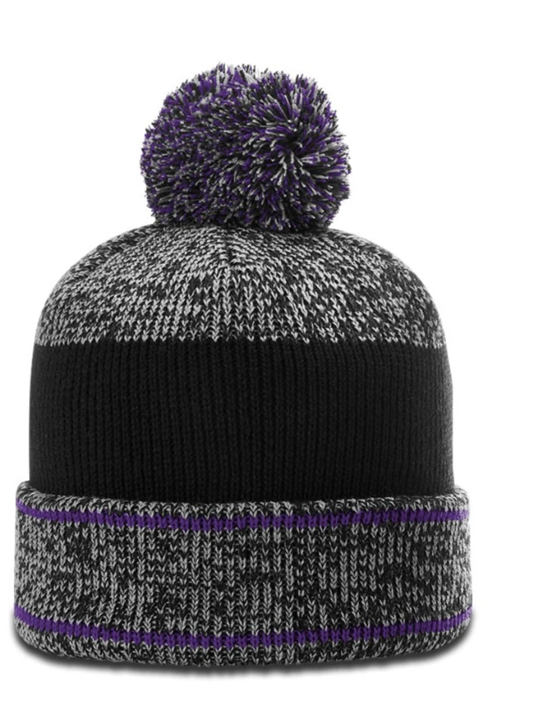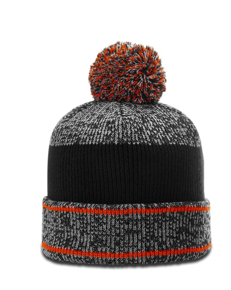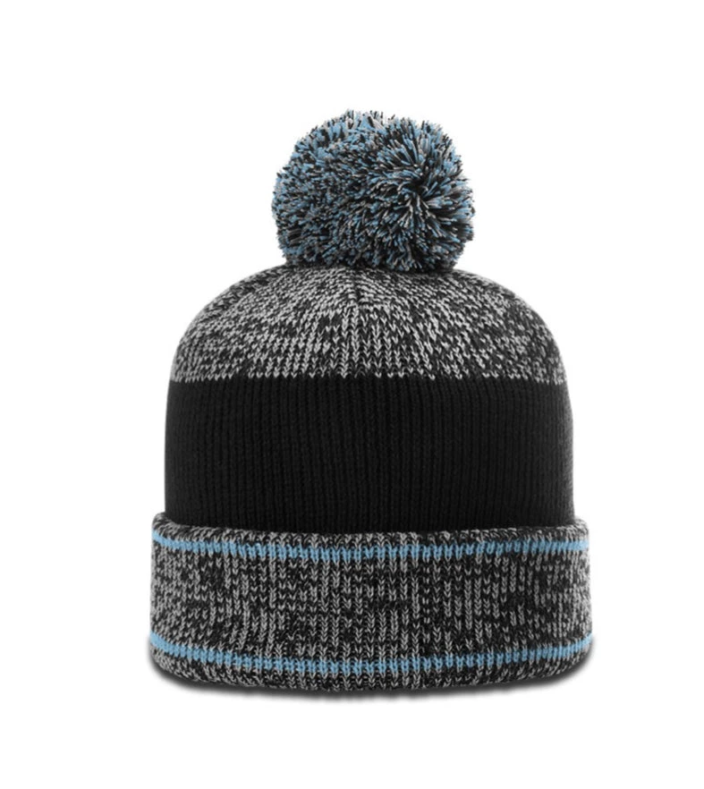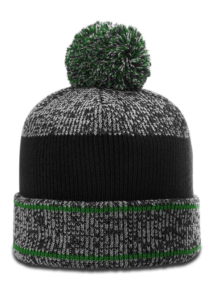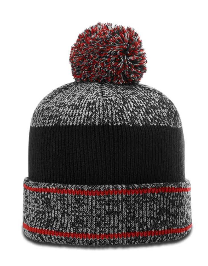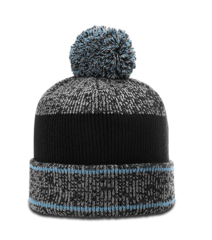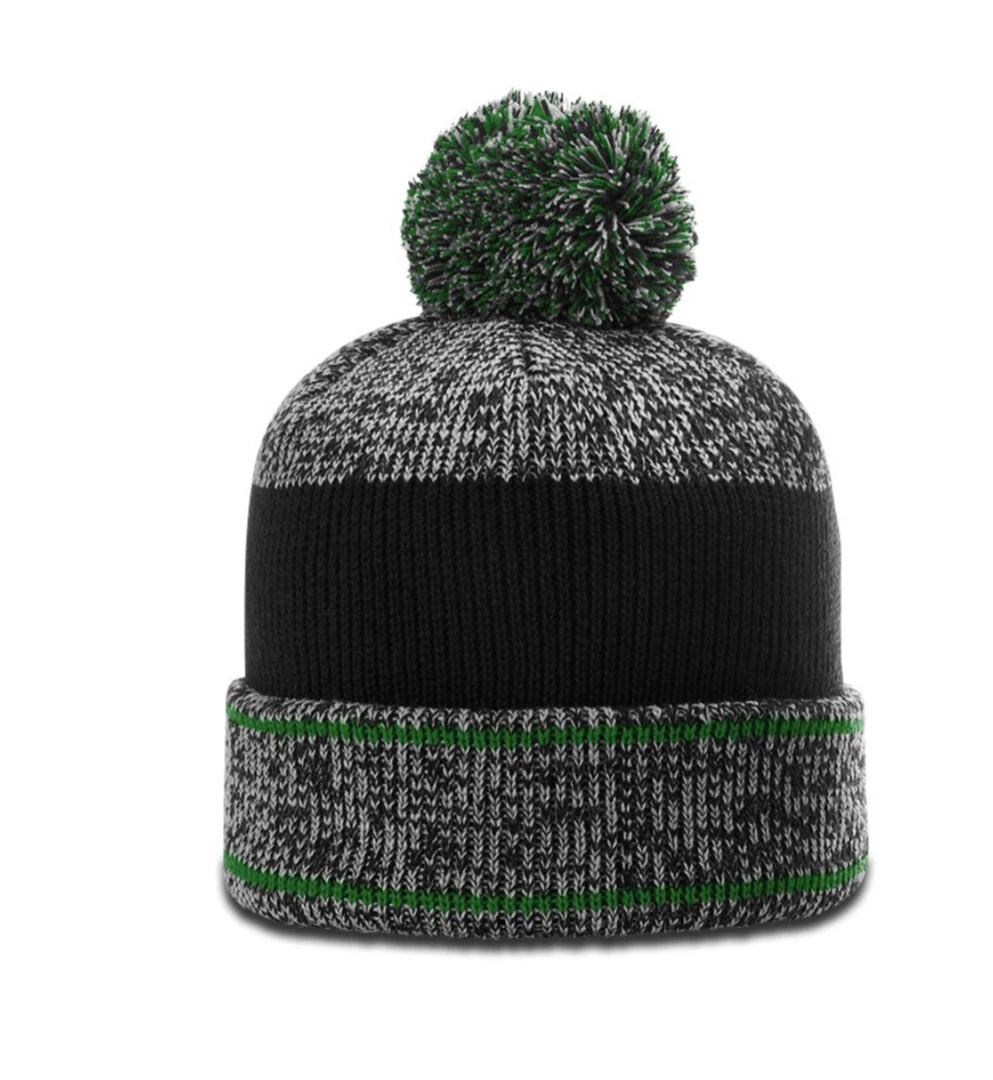100% acrylic construction is lightweight, soft and warm with a wool-like feel. The cuff provides 360° of space for a custom patch or embroidery, and the three-stripe design and pom add some complementary color to this on-trend style.